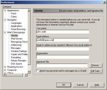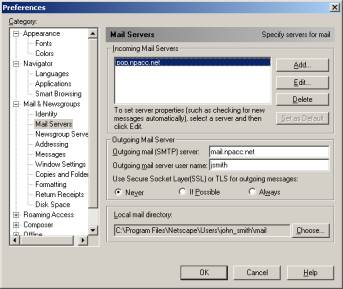 Begin by opening Netscape. Click on Edit, then Preferences.  Click on Navigator. Complete the next screen as pictured.  Click the [+] next to Mail & Newsgroups.  Click on Identity and complete the next screen as pictured.  Click on Mail Servers. Complete the next screen as pictured, then click on Edit in the Incoming Mail Servers section.  Complete the General screen as pictured. Click on OK to close Mail Server Properties.  Click on OK to close the Preferences screen. Top » |
